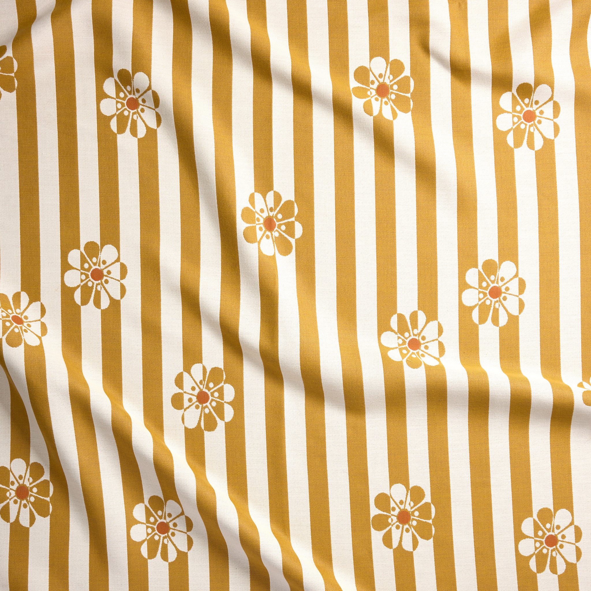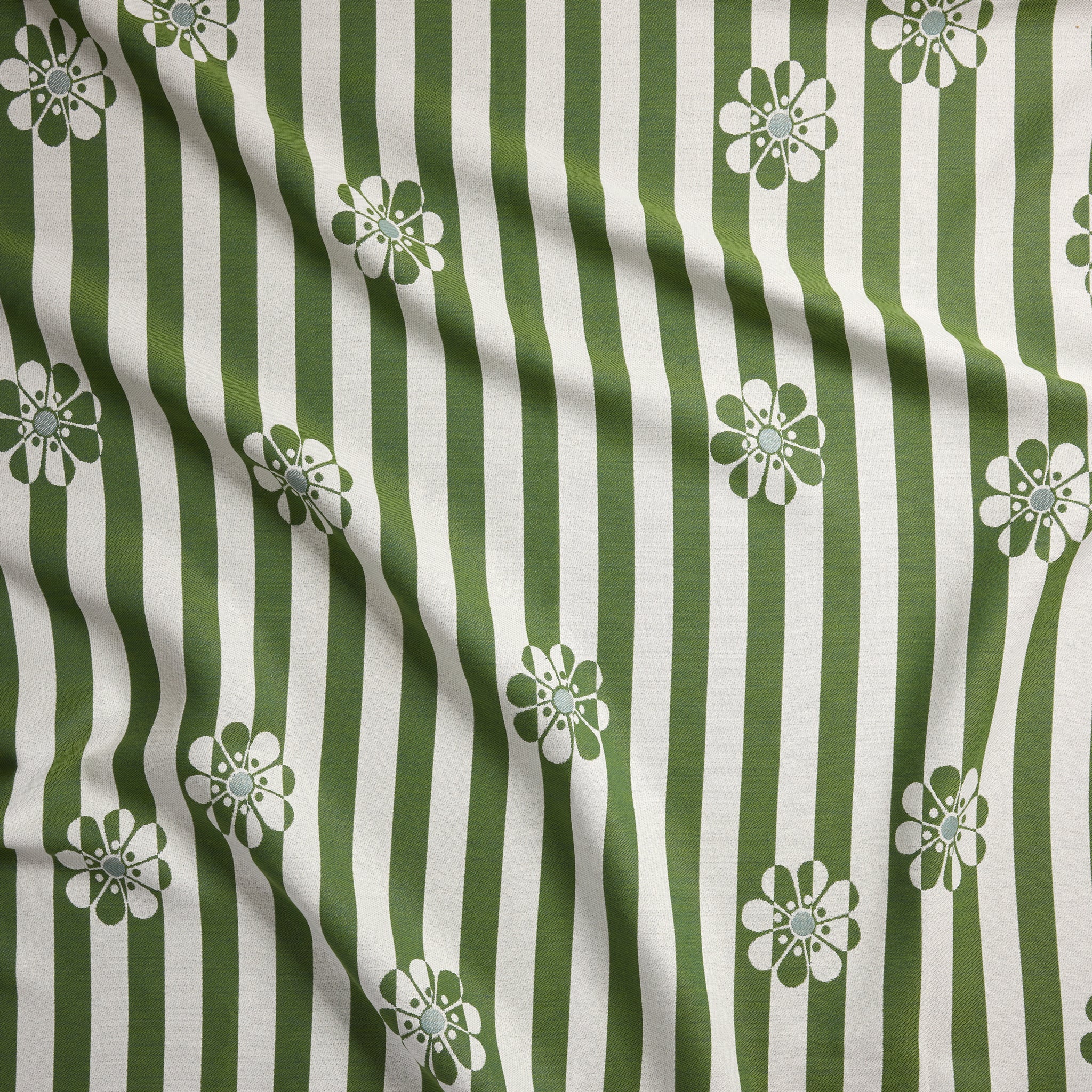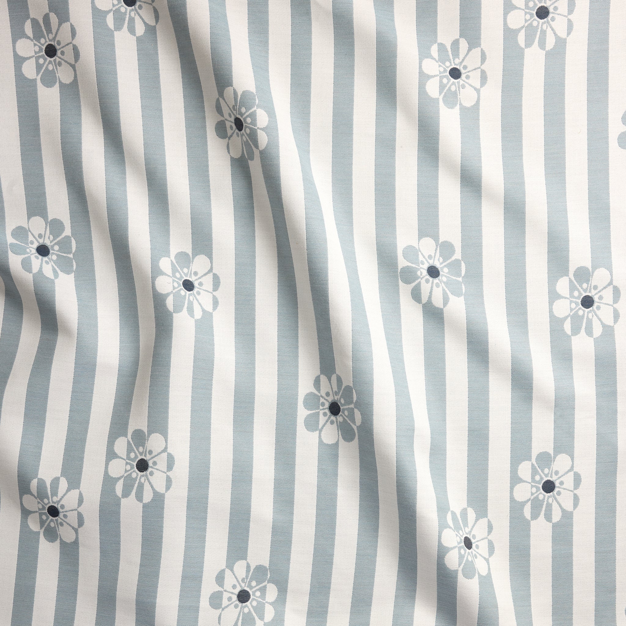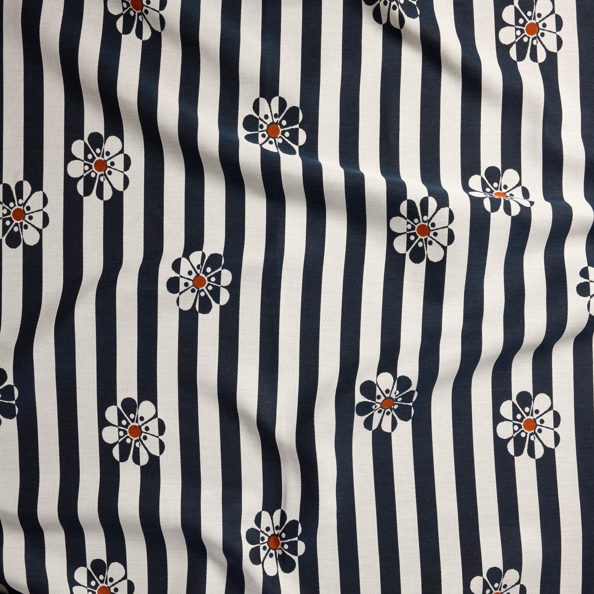 Amid the bright optimism of the 1960's, our second-generation owner, Lucile Stockwell Chatain, felt compelled to dream up many iterations of the perfect daisy. We picked one of our favorites and toyed with it until it took residence inside this shimmering positive-negative stripe. Never ones to stop at simple, we topped our daisies off with contrasting center dots.